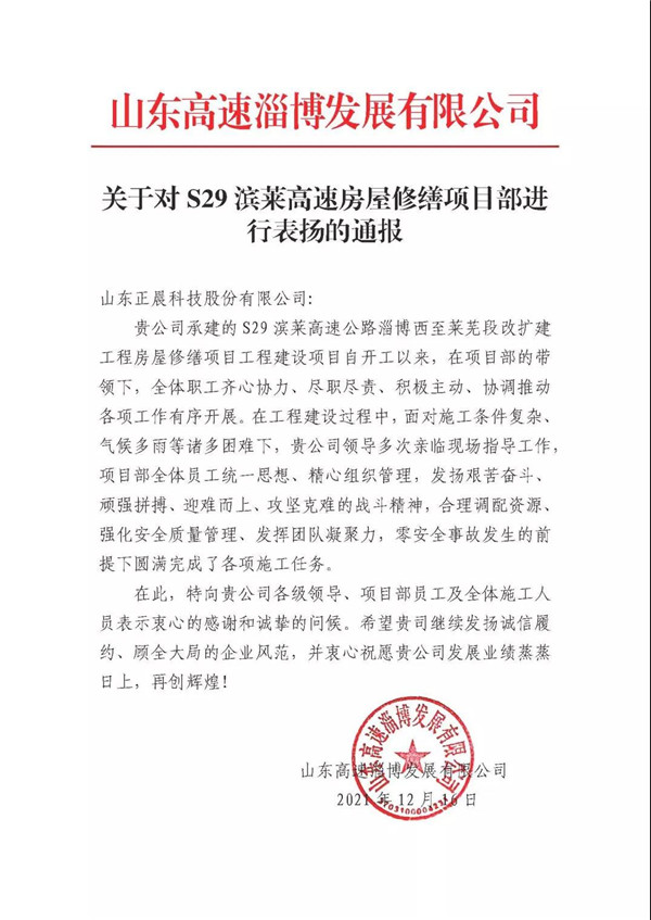近日,半岛集团官网_半岛online(中国)承建的S29滨莱高速公路淄博西至莱芜段改扩建工程房屋修缮项目获得业主表扬!