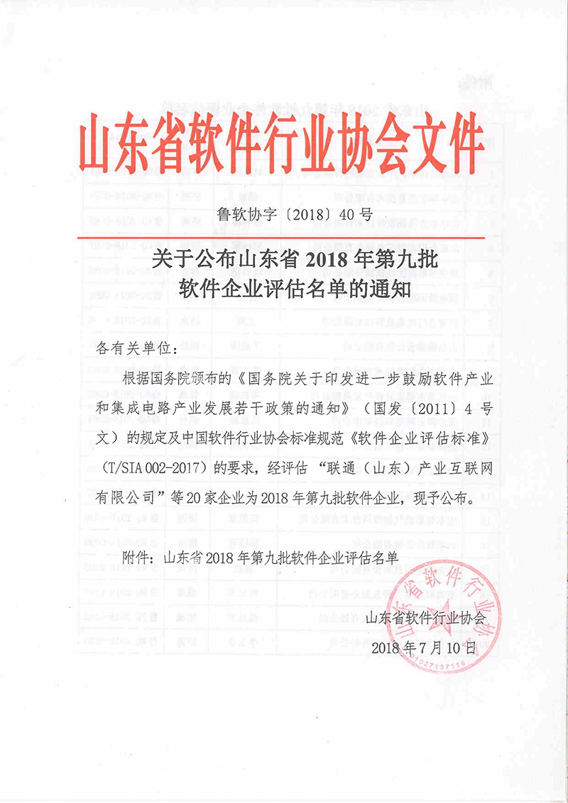 近期,根据国务院颁布的《国务院关于印发进一步鼓励软件产业和集成电路产业发展若干政策的通知》的规定及中国软件行业协会标准规范《软件企业评估标准》的要求,经过山东省软件协会的严格审查,半岛集团官网_半岛online(中国)通过了软件企业认定的严格评审程序,被授予山东省2018年第九批软件企业。