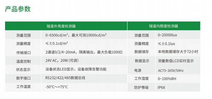 隧道光强检测器是专业用于检测隧道内外亮度和照度的精密仪器。该产品外壳均采用铝制,防护等级可高达IP68。检测器内部的加热装置能使温度因素对硅光二极管组成的光电池的影响降到最低,进一步保障仪器的检测精度。